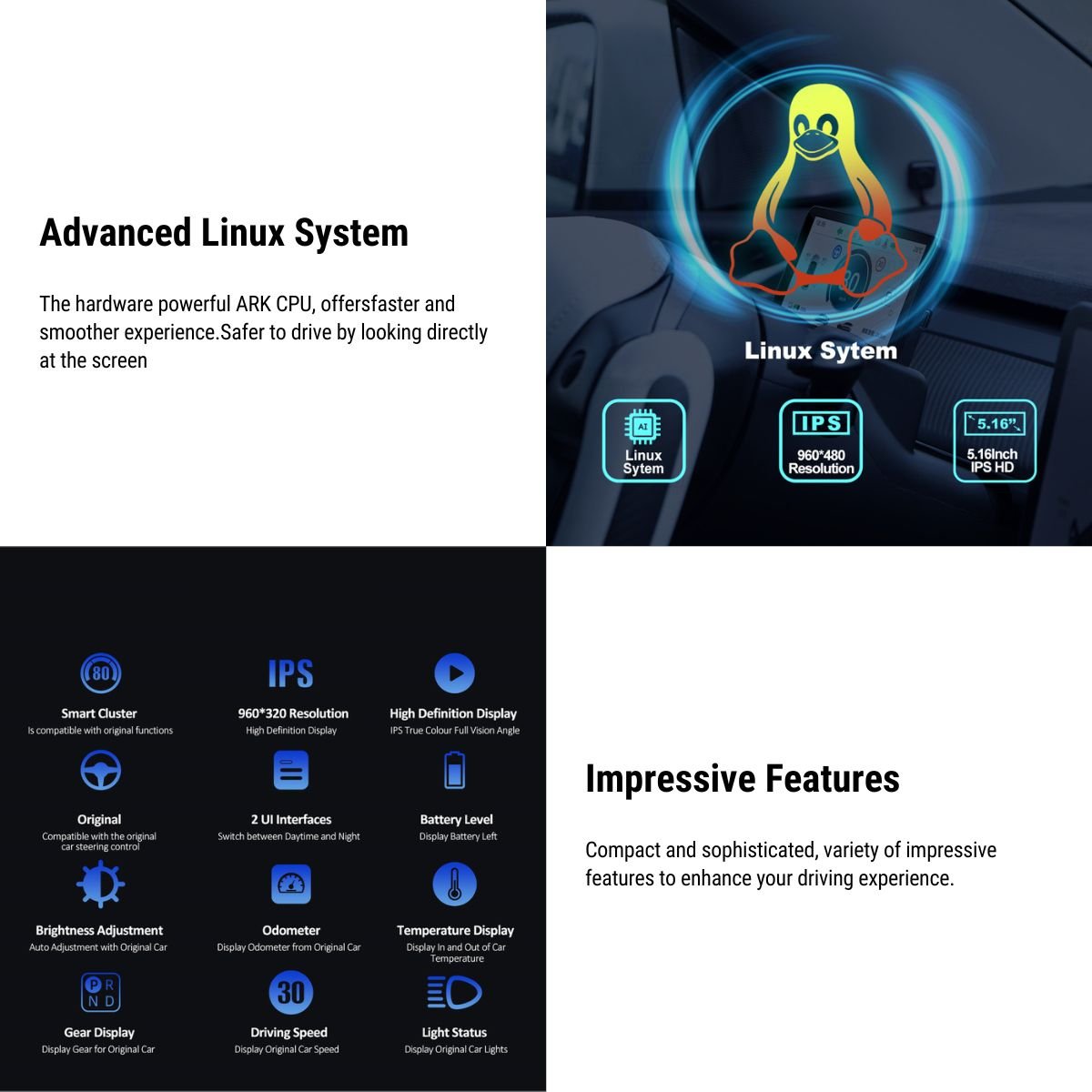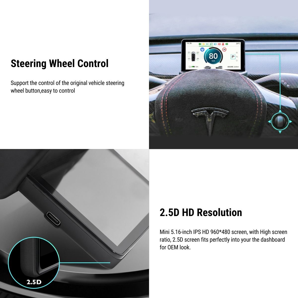 - Compatible Models - 5.16-inch instrument dashboard display is specially customized for Model Y 2020-2023 and Model 3 2017-2023, compatible with Intel Atom and AMD Ryzen CPU.