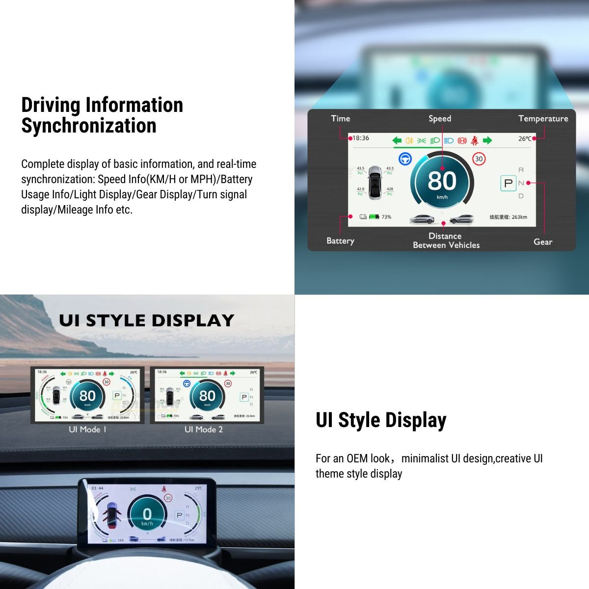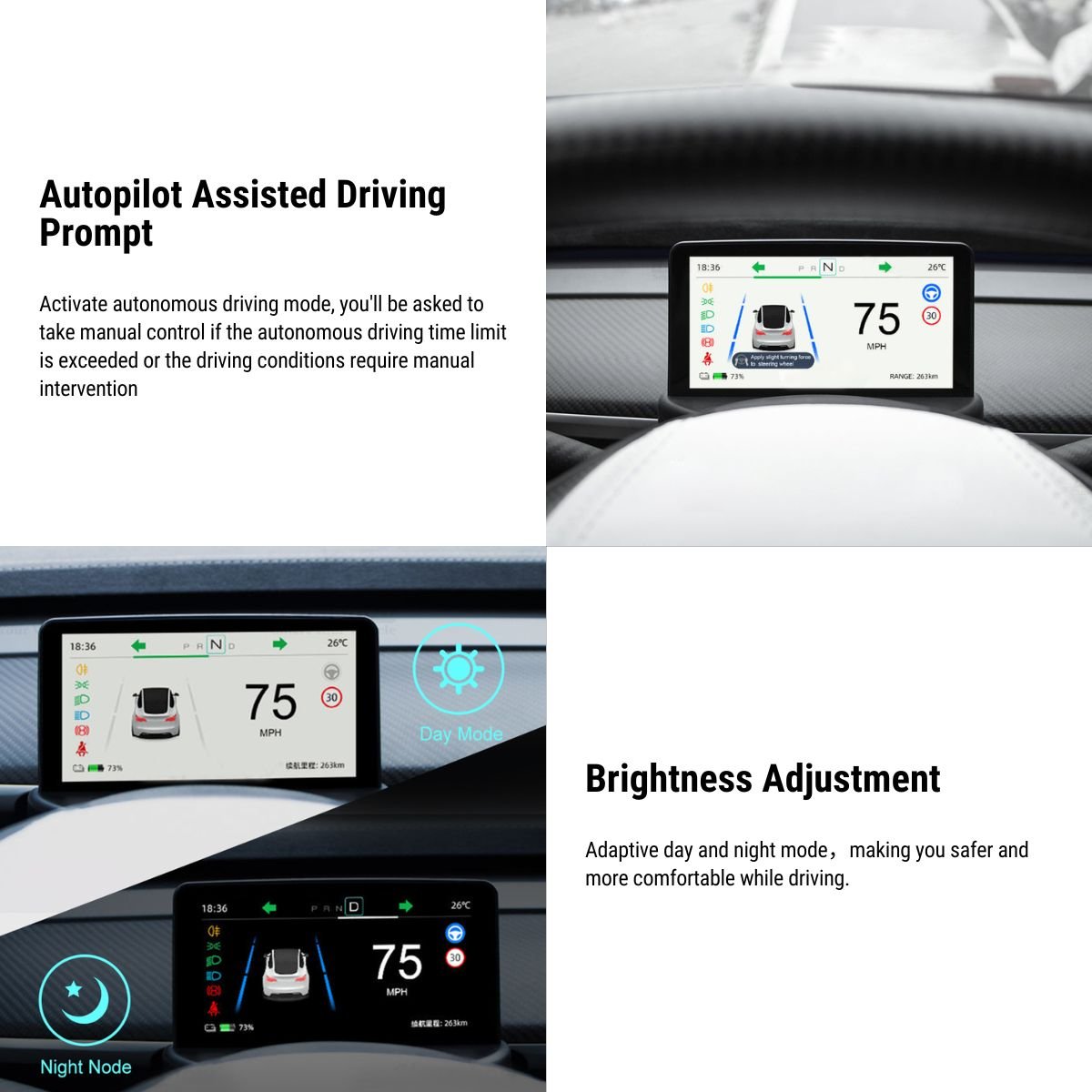 Display Dashboard Instrument for Tesla Model 3(2017-2023) & Model Y (2020-2023) . Refuse to look down and make driving safer. Tight-fitting body design, Multiple features. With a Tesla OEM style UI interface that blends modern technology with classic black elements, it matches your Tesla Model Y and Model 3 perfectly. Unlike a regular dashboard display, Display Dashboard Instrument for Tesla Model 3 / Model Y it comes with excellent adaptive day and night mode !